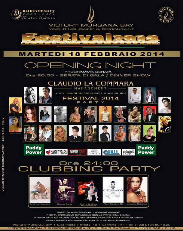 In occasione dell'Opening Party della settimana di Eventi collaterali, Victory Morgana Bay festeggia il suo 10° Anniversario in collaborazione con Claudio La Commara Management che celebra per il secondo anno consecutivo uno degli appuntamenti più attesi della stagione. L’evento vedrà la partecipazione di un parterre d’eccezione, con ospiti provenienti dal mondo dello spettacolo, dello sport, del giornalismo e dell’imprenditoria. Il programma prevede un Dinner Show dove si esibiranno i protagonisti di ITALIA’S GOT TALENT Andrea Novacco e Cesar Piombo; Igor e Andrea Matyushenko si esibiranno in esilaranti siparietti, l’eleganza delle Twins Dina e Dana ballerine di burlesque sedurranno i partecipanti e l’animazione resident Arte’x farà da contorno all’evento. Tra i tanti vip presenti anche Max Cavallari de I Fichi D’India, che si esibirà in alcuni dei suoi personaggi più famosi. E poi ancora: Bruno Barbieri, protagonista di Masterchef, Simone Rugiati altro chef stellato, Nina Moric, Stefano De Martino, Cecilia Rodriguez, Francesco Monte, Raffaello Balzo, Guendalina Canessa, Luca Marin, i velini di Striscia al Notizia e molti altri ancora. A partire dalle ore 24.00 prenderà il via la CLUBBING NIGHT con un dj set d’eccezione che vedrà in consolle Alex Gaudino, affiancare i Dj Resident. Special Voice Jeanine. Parteciperà alla serata Davide Penna Dj.