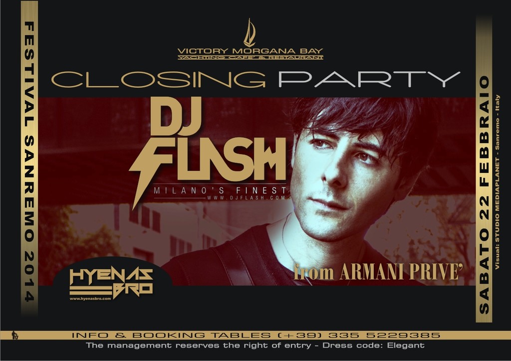 A chiudere la settimana Dj Flash, DJ Resident dell'esclusivo Armani Prive 'di Milano, noto per la sua alta energia e dj set eclettici. Dj Flash ha suonato per diverse star internazionali come: Leonardo Di Caprio, Bar Rafaeli, Janet Jackson, Tom Cruise, Chris Brown, Eve, Bruce Willis, Ben Stiller, Clive Owen, Paris Hilton, Roberto Cavalli, Dolce & Gabbana, Nelly Furtado, Craig David , Alicia Keys, Wesley Sneijder, ed è spesso ospite nei club più esclusivi di tutto il mondo e negli ultimi anni ha suonato a New York, Mosca, Londra, Parigi, Istanbul, Belgio, Svizzera, Novosibirsk in Siberia, Amsterdam, Zurigo, Egitto, Marocco, Dubai e ora SanRemo per far divertire la movida notturna della Riviera!