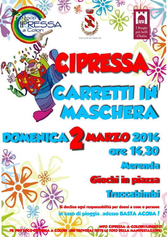 Oggi pomeriggio a Cipressa, dalle 14.30, appuntamento con la festa di Carnevale 'Carretti in maschera' organizzata dalla Pro Loco Cipressa a colori.