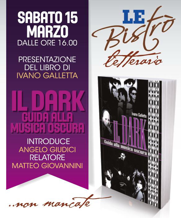 Sabato 15 marzo alle ore 16.00, si terrà la presentazione del libro 'Il Dark - Guida alla musica oscura' di Ivano Galletta, presso 'Le Bistrot letterario' di Leclerc. Angelo Giudici introdurrà il pomeriggio e Matteo Giovannini presenterà l'autore.
