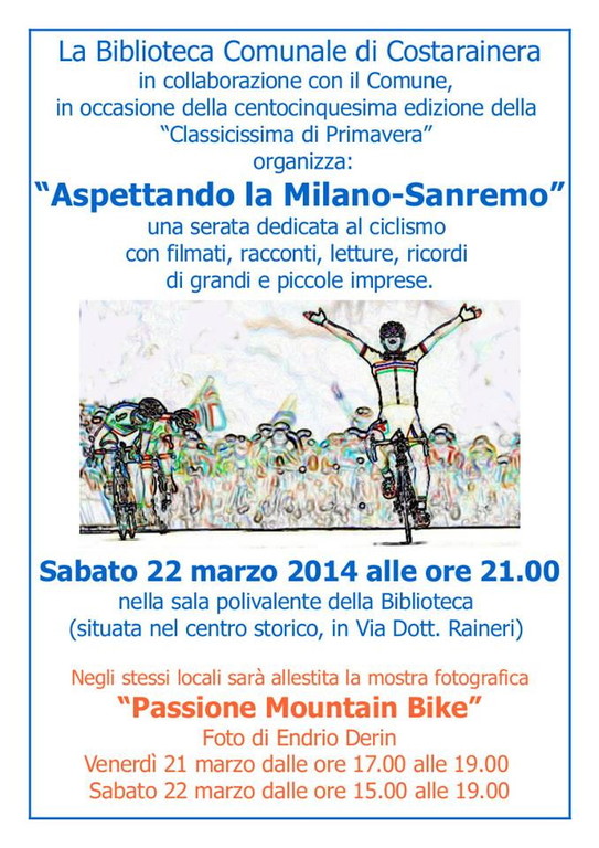 La Biblioteca Comunale di Costarainera, sita nel centro storico, in occasione della centocinquesima edizione della “Classicissima di Primavera” organizza questa sera alle 21 un incontro dedicato al ciclismo e non con filmati, racconti, letture, ricordi di grandi e piccole imprese.