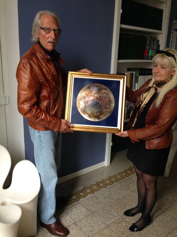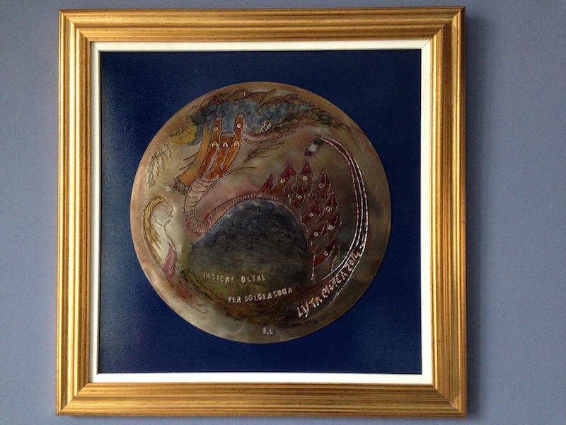 “Incisione su lastra in acciaio inox raffigurante i simboli di Dolceacqua, un angolo di Liguria ricco di storia, di ricordi,di sofferenza,uomini che con fatica e maestria ci hanno trasmesso con il lavoro e significati i valori dell’uomo. - spiega Elio Lentini - L’opera nasce dalla riflessione dell’autore che vive e risiede a Dolceacqua. I simboli tramandati hanno bisogno di un significato per vivere,come fonte di ispirazione, di valori sociali ed etici per una migliore Dolceacqua. Uomo-spazio-natura. Nei simboli espressi c’è la misura del nostro linguaggio, delle nostre parole, un insieme di alti valori: sono l’amore,il coraggio,la comprensione, la dignità e la coscienza. L’artista si identifica con i contenuti simbolici ed esprime e identifica nel modo migliore il rapporto tra l’uomo e lo spazio, il contenuto dell’opera sostanzia il valore, la testimonianza di chi ci ha preceduto".