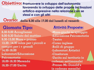 L'obiettivo è quello di impegnare in modo costruttivo e creativo il tempo libero dei bambini attraverso attività di gioco, promuovere lo sviluppo dell'autonomia favorendo lo sviluppo delle proprie inclinazioni artistico-espressive nella relazione con se stessi e gli altri.