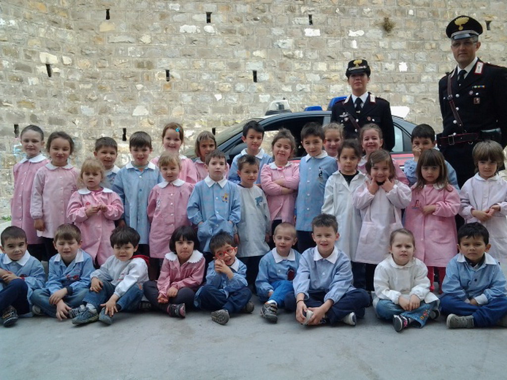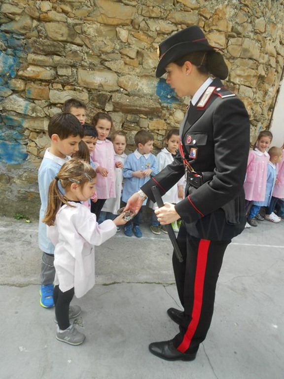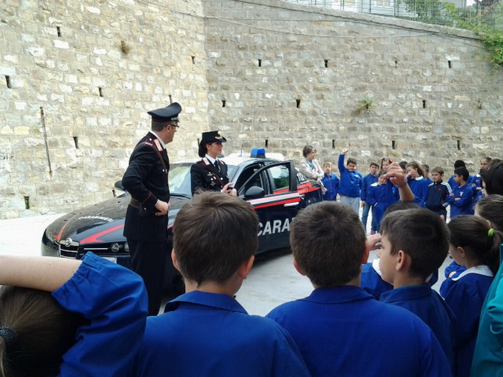 A tal proposito registriamo le riflessioni dei bambini della classe seconda che, molto semplicemente, ci raccontano ciò che è loro rimasto impresso: "I Carabinieri ci hanno detto che dobbiamo sempre stare attenti e che quando qualcuno che non conosciamo si avvicina a noi e dice 'Vieni con me' bisogna andare subito dai genitori. Poi loro ci hanno fatto sentire come si suona la sirena, la cosa che mi è piaciuta di più. La sirena, quando l’ho sentita suonare direttamente dall’auto di servizio era veramente rumorosa. Ci hanno anche mostrato il manganello, spiegandoci che quando un ladro è troppo agitato i Carabinieri mostrano il manganello e il ladro si spaventa. Ci hanno raccomandato di non alzare mai le mani, cioè che non bisogna picchiare mai nessuno per nessun motivo. Io ho capito che un carabiniere non va solo in macchina, ma si spostar anche col paracadute, col cavallo, può anche nuotare e andare in barca. I carabinieri avevano tantissimi distintivi. Abbiamo visto persino la pistola e le manette. Le manette erano d’acciaio e pesanti".