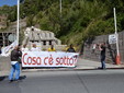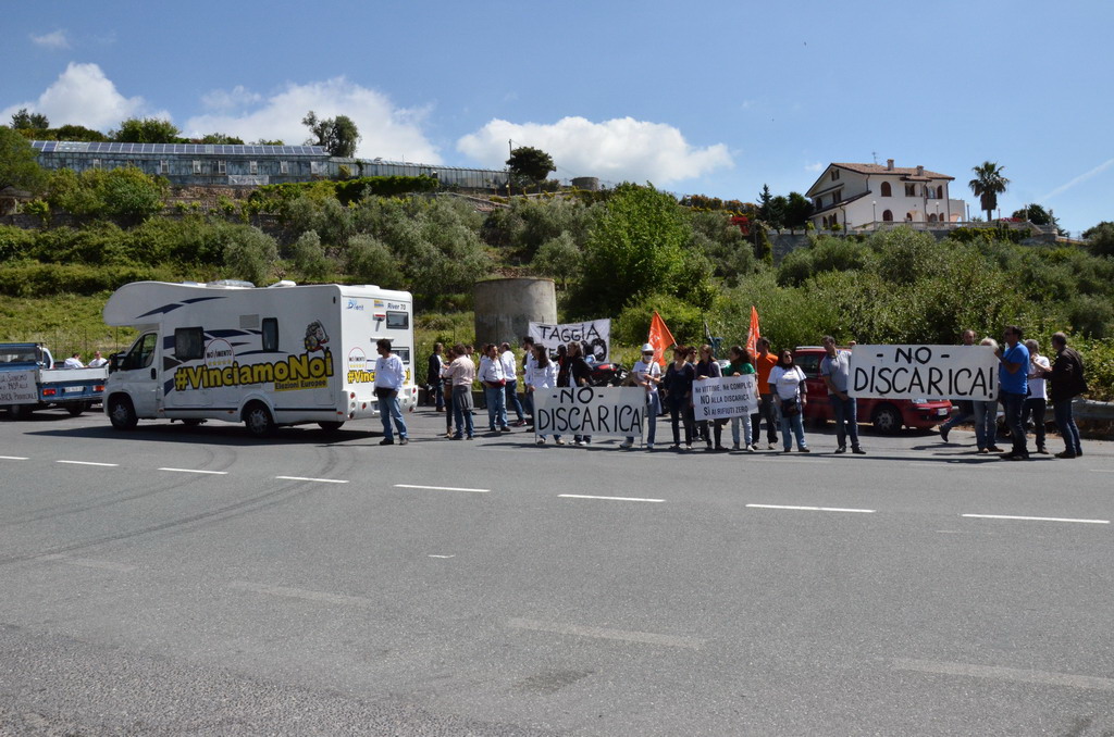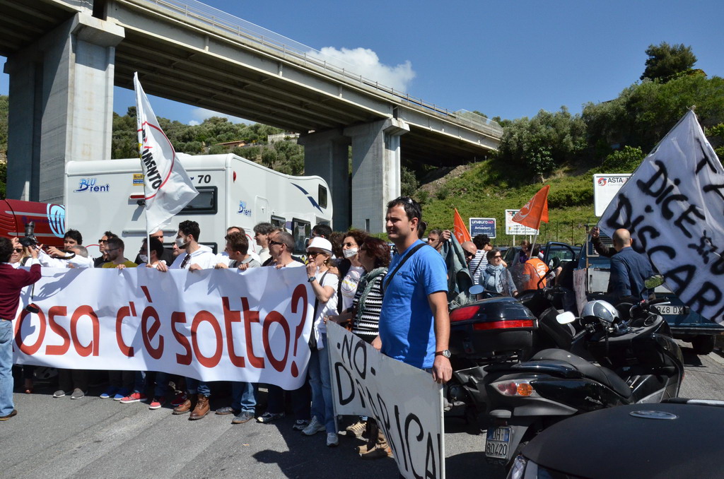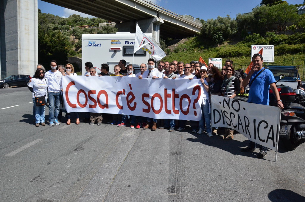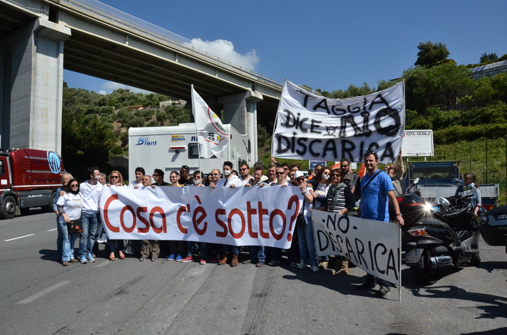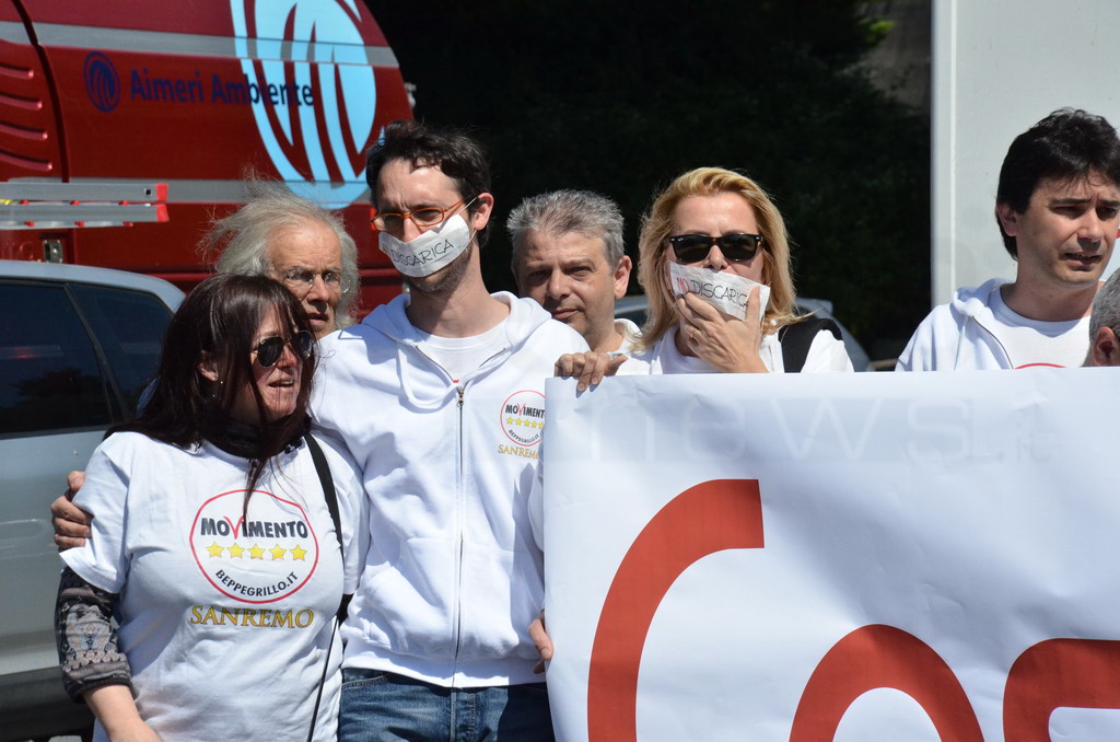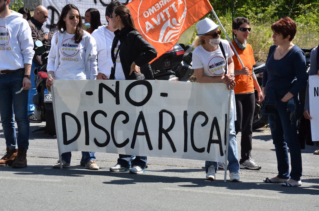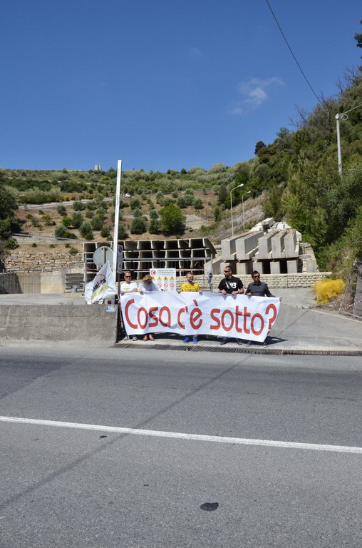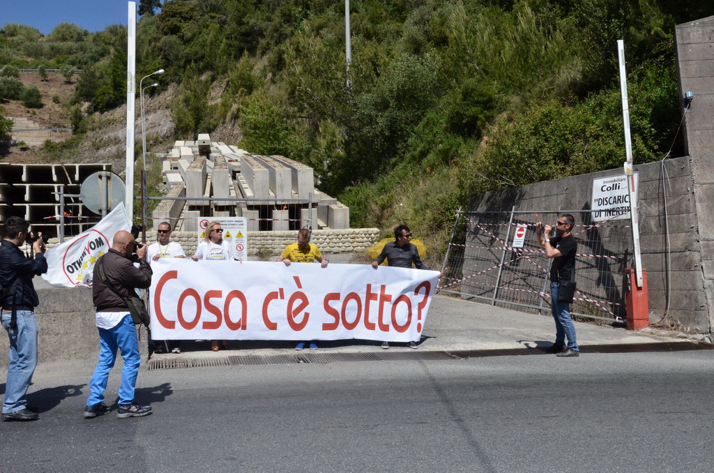 Manifestazione pacifica nei pressi dell'ingresso della discarica di Collette Ozotto a Taggia, questa mattina per il Movimento 5 Stelle di Sanremo (presenti anche alcuni esponenti di 'Sanremo Attiva' e dei comitati 'No discarica' della zona tra Taggia e Sanremo, ndr). Capitanati dal candidato a Sindaco Paola Arrigoni e da tre parlamentari savonesi (Matteo Mantero, Sergio Battelli e Simone Valente) circa 50 'grillini', insieme ad una decina di esponenti delle altre associazioni, hanno esposto i loro vessilli e cartelli tra cui il 'Cosa c'è sotto', poi proposto anche al di fuori dell'ingresso della discarica, sotto il diretto controllo degli agenti del Commissariato, intervenuti sul posto.