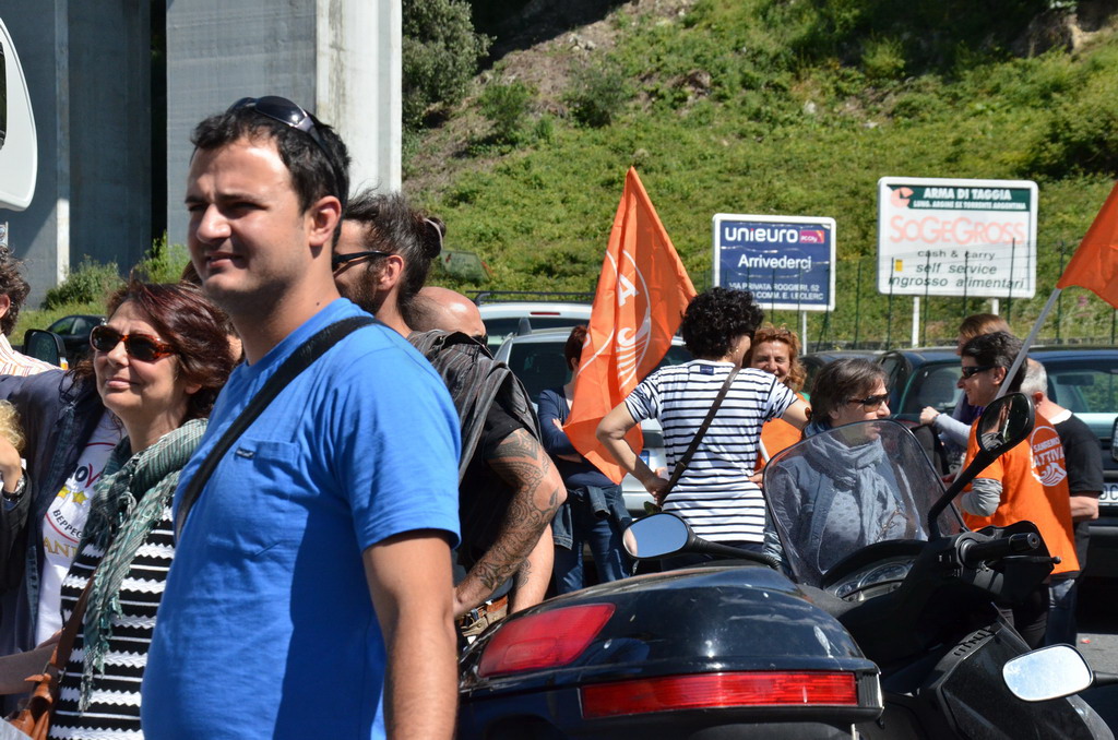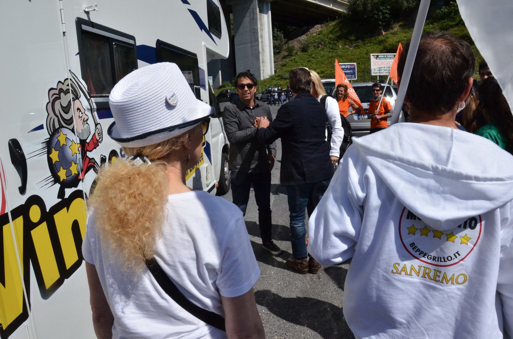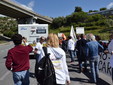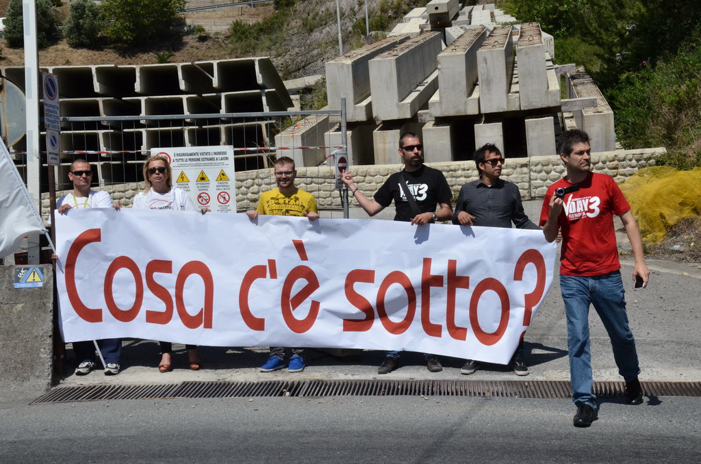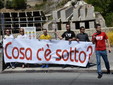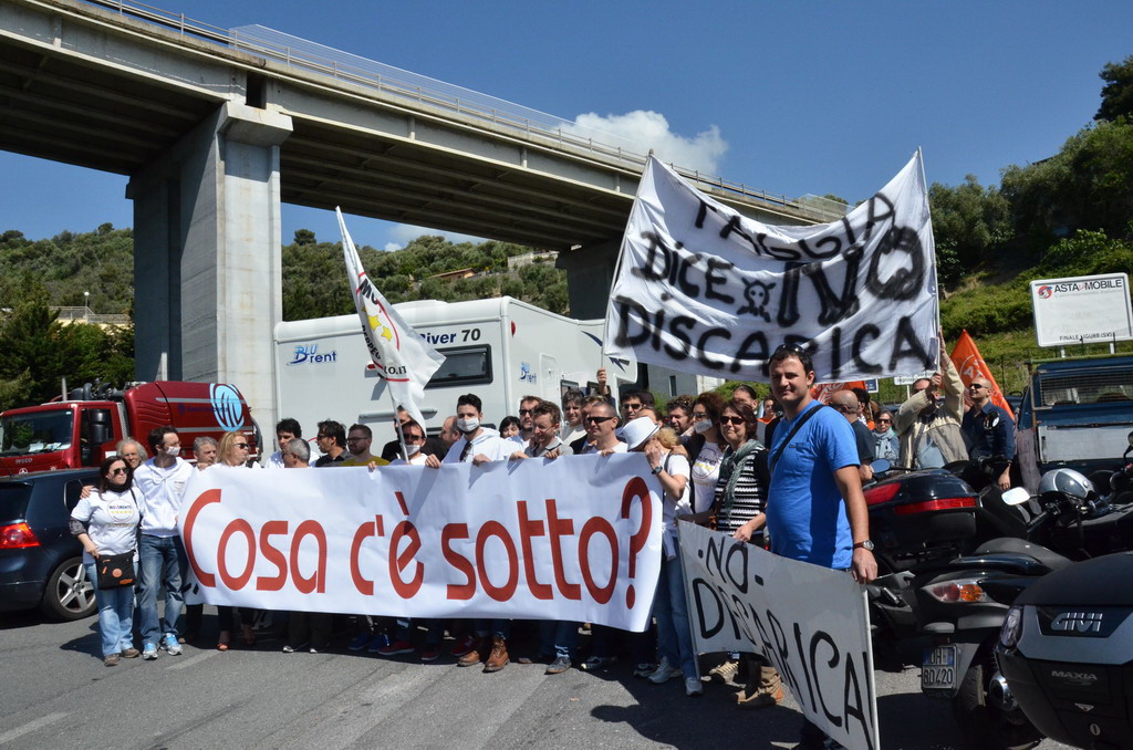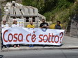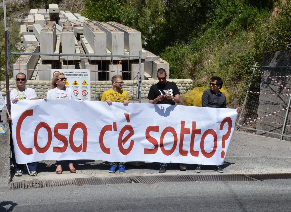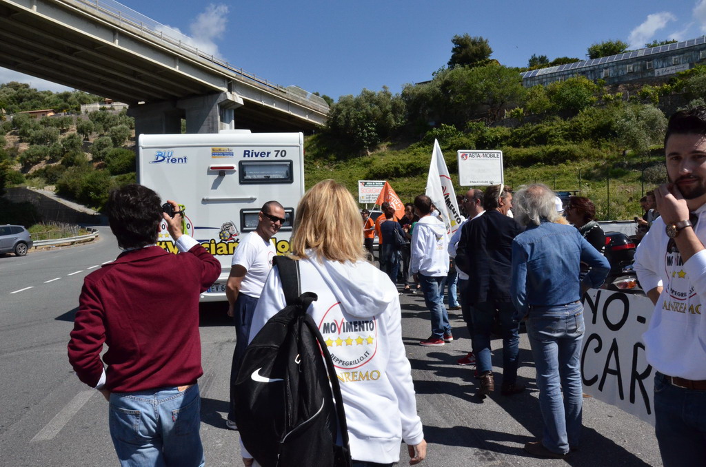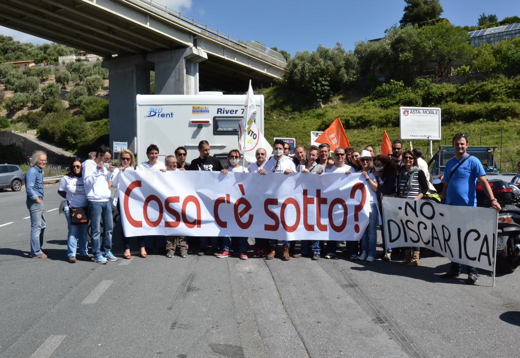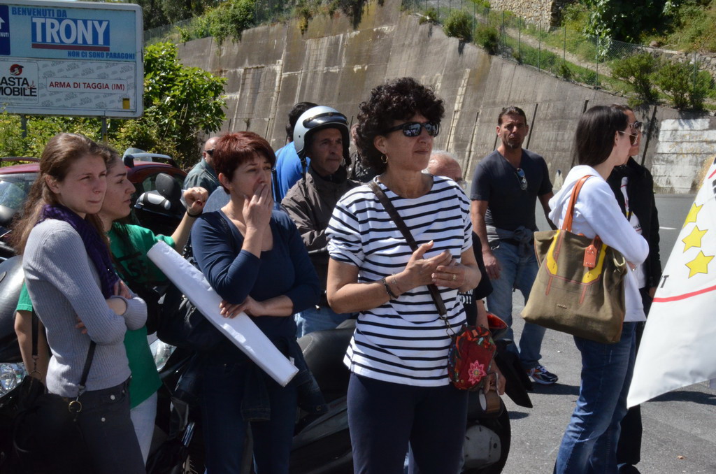 Manifestazione pacifica nei pressi dell'ingresso della discarica di Collette Ozotto a Taggia, questa mattina per il Movimento 5 Stelle di Sanremo (presenti anche alcuni esponenti di 'Sanremo Attiva' e dei comitati 'No discarica' della zona tra Taggia e Sanremo, ndr). Capitanati dal candidato a Sindaco Paola Arrigoni e da tre parlamentari savonesi (Matteo Mantero, Sergio Battelli e Simone Valente) circa 50 'grillini', insieme ad una decina di esponenti delle altre associazioni, hanno esposto i loro vessilli e cartelli tra cui il 'Cosa c'è sotto', poi proposto anche al di fuori dell'ingresso della discarica, sotto il diretto controllo degli agenti del Commissariato, intervenuti sul posto.