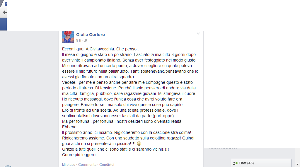 "Il prossimo anno. ci risiamo. Rigiocheremo con la cascione stra colma! Rigiocheremo assieme. Con uno scudetto sulla calottina ragazzi! Quindi guai a chi nn si presenterà in piscina!!!!".