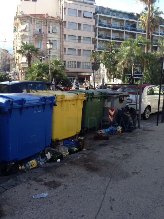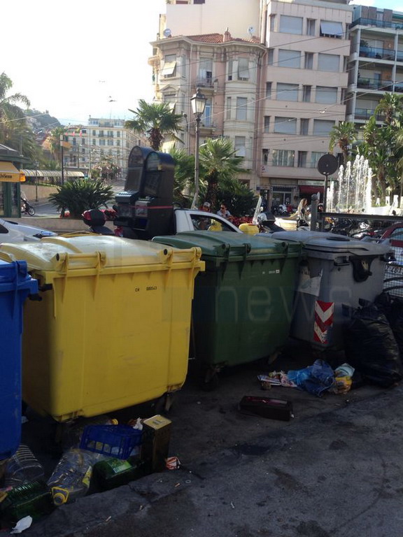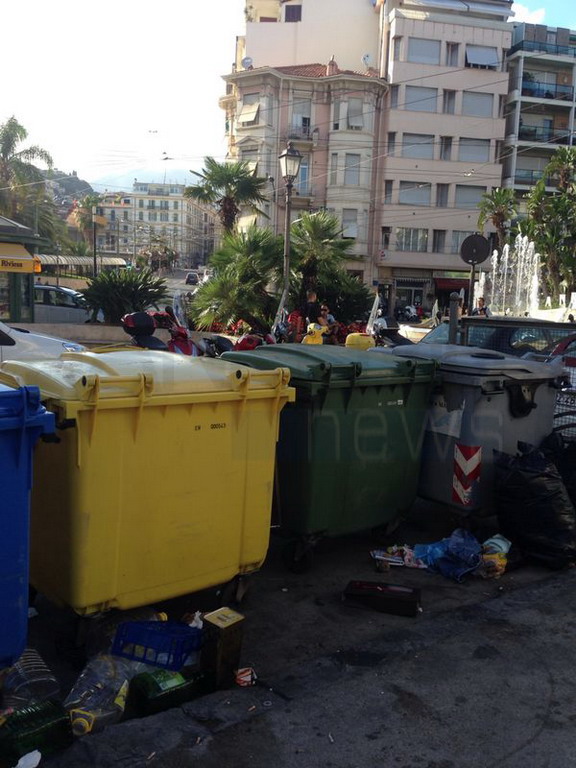 Sanremo: immondizia attorno ai cassonetti vicino allo Zampillo in pieno centro, le foto del degrado