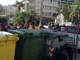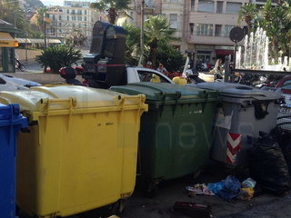 Sanremo: immondizia attorno ai cassonetti vicino allo Zampillo in pieno centro, le foto del degrado