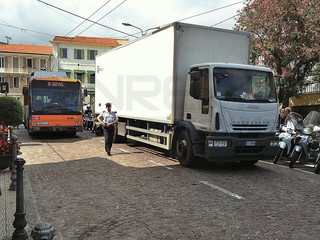 Un camion, che doveva scaricare in un negozio del centro città ha bloccato per oltre mezz'ora il traffico tra piazza Colombo e via Roma.