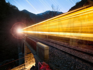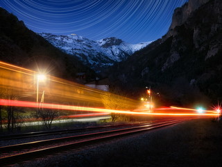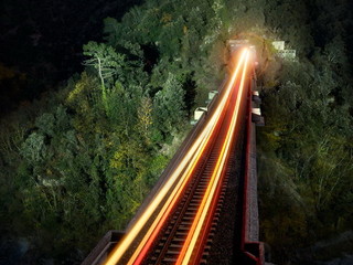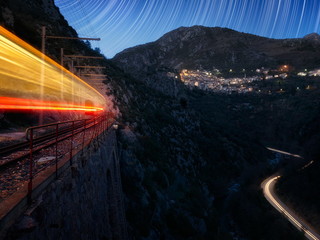 Come potete vedere trattasi di vari scenari notturni caratterizzati da composizioni particolari i cui soggetti principali sono: 1) La scia luminosa del passaggio del treno al buio 2) La scia luminosa del passaggio dei veicoli su strada 3) La scia luminosa delle stelle (tranne in 2 soli statti) Un gioco di scie luminose per delineare un sistema in continuo movimento il cui moto si vuole e si spera non cessi mai. Come appunto si spera nella continuazione dell'uso e dell'importanza della Linea Ferroviaria Cuneo-Ventimiglia. Per la realizzazione del progetto ho usato la mia fidata Nikon D7000 accompagnata dal Nikkor 10-24 e dal Nikkor 18-105. In alcuni casi mi sono affidato ad un intervallometro esterno e allontanandomi dalla fotocamera (opportunamente nascosta) procedevo con la tecnica del Light Painting con l’ausilio di una lampada frontale e una torcia a LED.