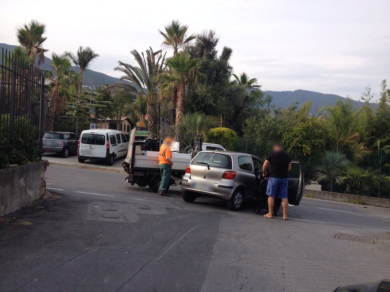 "Ennesimo incidente tra via Padre Semeria angolo strada Bonmoschetto a Sanremo. La causa come sempre è la siepe del terreno del monastero che confina con le due strade. La siepe come si intravede dalla foto impedisce completamente la visuale a chi si immette nella trafficata via Padre Semeria. L'unica possibilità per vedere chi arriva da monte è sporgersi con la proposta vettura fino quasi alla riga di mezzeria. Ma come è possibile che nessuno provveda a far rimuovere una siepe? Si aspetta il morto anche qui?"