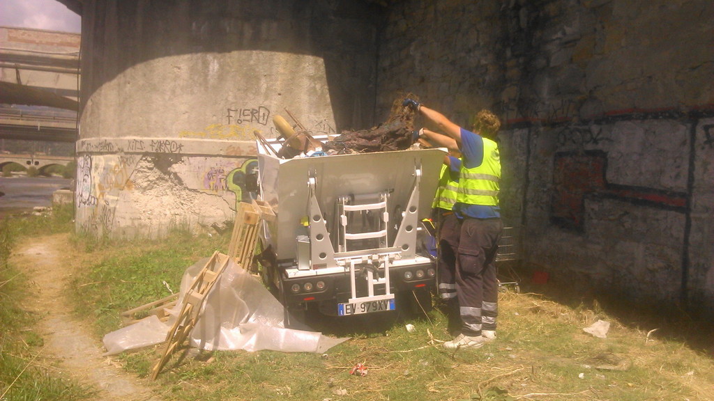La Polizia Locale di Ventimiglia, con l’ausilio della Ditta Docks Lanterne spa, ha fatto rimuovere un accampamento sorto sul greto del Fiume Roja, in pieno centro cittadino sotto il Ponte Doria.