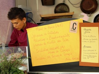 PanBusta con condiglione; Crostone con pesto di fave e piselli e seiras; Gnocchetti di erbe spontanee; Cajette di pane e erbe aromatiche; Focaccine assortite; Tortello piastrato con zucchine e fiori; Frittino salato: polentina di ceci e rosmarino, panfritto, verdure in pastella, fiori e foglie pastellate, sgonfiotti di zucchine ed erbette; Frittino dolce: semolino: limone, cacao, cacao/cannella, caffè, arancio, frittelline di mele, di acacia e sambuco, amaretto;Pan brioches con geelatina ai fiori; Rotolo di meringa morbido con fondente; Stecco goloso e Pane burro di montagna e zucchero. Nella sua prima uscita pubblica ha registrato i giudizi positivi ed i complimenti dell'autore delle ricette, Libereso Guglielmi