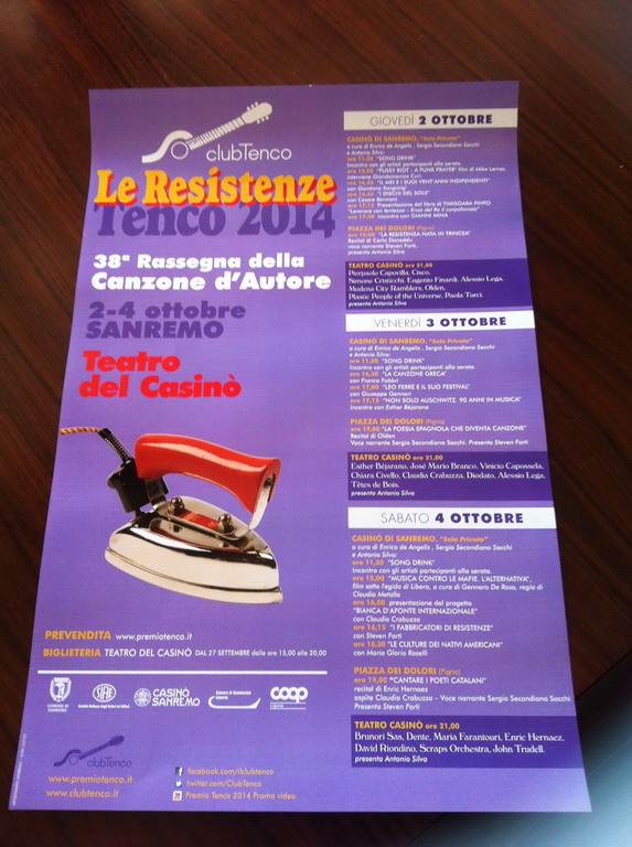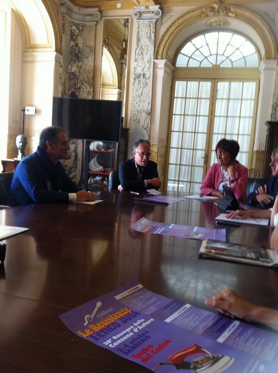 Questa mattina al Comune di Sanremo, in presenza del Sindaco Alberto Biancheri e dell’assessore al turismo e alla cultura, Daniela Cassini e dei dirigenti dell’associazione del ‘Club Tenco’ è stata presentata la ‘Rassegna della Canzone d'Autore, Premio Tenco 2014’ che si terrà al Teatro del Casinò dal 2 al 4 ottobre prossimo. L’Assessore Cassini comunica che l’edizione 2014 sarà ricca di eventi e sottolinea: "Sanremo con il Festival della Canzone Italiana e con il Premio Tenco è davvero la capitale nazionale della musica. Con il Premio Tenco in particolare l'orizzonte si amplia e diventa internazionale e Sanremo si trasforma il crocevia di nuova musica e di eccellenti scoperte a livello mondiale. Quello che all’amministrazione sanremese è sempre piaciuto del premio Tenco è l’offerta di una musica di qualità, con nuovi talenti che vengono da lontano e anche quest’anno, questa grande tradizione è confermata dalla presenza di tante culture musicali antiche e moderne e di ben 73 artisti di tutto il mondo, che si incontrano sul tema delle resistenze al Teatro del Casinò".