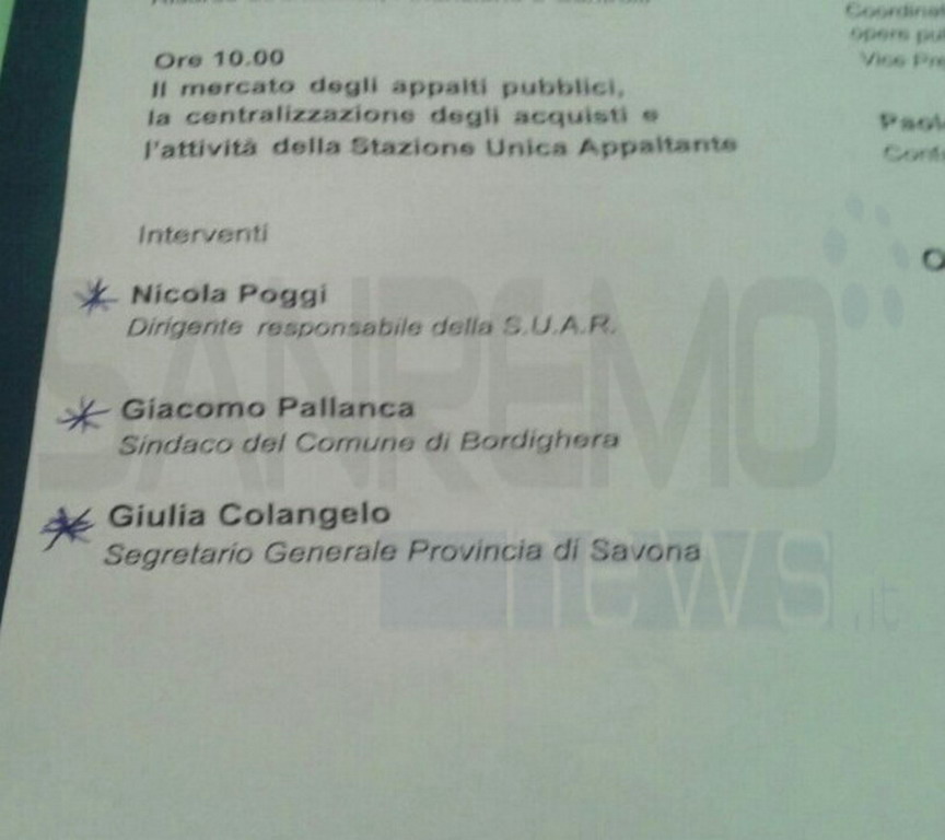 L'amministrazione comunale di Bordighera, con il nuovo corso guidato dal Giacomo Pallanca, e' stata tra le prime ad affidarsi al Suar (stazione unica per gli appalti a livello regionale). E oggi il primo cittadino bordigotto era l'unico amministratore pubblico dell'intera Liguria a presenziare al tavolo rotondo cui hanno partecipato i massimi vertici regionali.