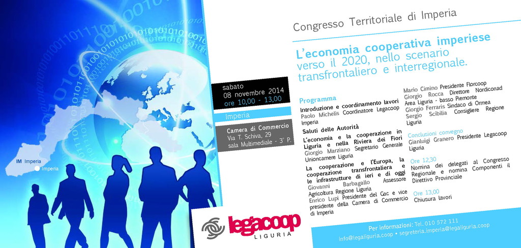 Domani, dalle 10 alle 13, presso la sede della Camera di Commercio di Imperia sala Multimediale, si svolgerà il congresso territoriale di Imperia di Legacoop Liguria. Il dibattito avrà al centro i temi dell’economia cooperativa imperiese verso il 2020 nello scenario transfrontaliero e interregionale.