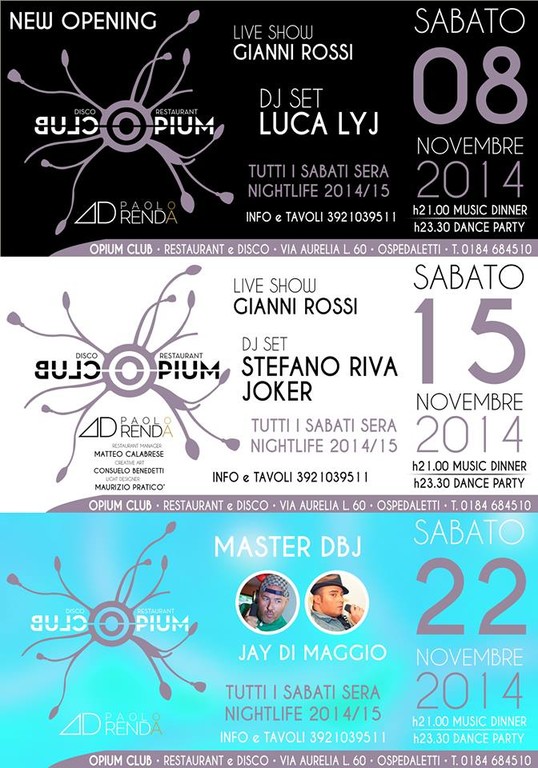 Appuntamento mondano, l' 8 novembre, con l'inaugurazione di un nuovo locale, Opium Club, ristorante e discoteca, Marina di Capo Nero, Ospedaletti. Apertura delle porte al pubblico per le 21 con la cena menù degustazione.