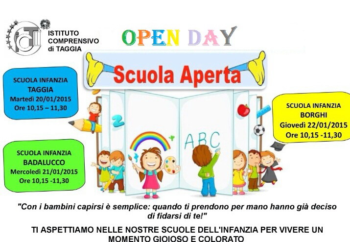 In vista dell'apertura delle Iscrizioni per l'anno scolastico 2015-2016 le Scuole dell'Infanzia dell'Istituto Comprensivo Taggia (Taggia, Borghi e Badalucco) proporranno delle giornate di Scuole a porte aperte per far conoscere gli ambienti, le proposte didattiche e il personale educativo di ciascuna.