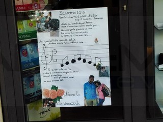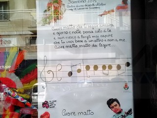“L'amore nel Festival”: questo è il tema scelto dai ragazzi e gli operatori del centro diurno disabili Atelier per i cartelloni destinati a decorare le vetrine di via Agosti e, da quest'anno anche di piazza San Siro e dintorni. Si tratta di cartelloni, appunto, su cui viene trascritto un rigo musicale e qualche frase della canzone, poi raccontata attraverso immagini a decoupage.