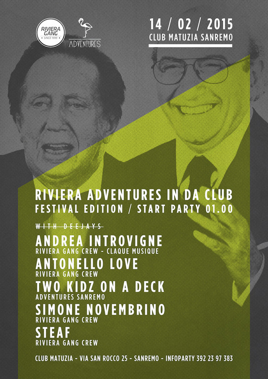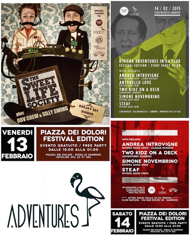 A pochi passi dal centro dove avranno luogo le ultime due serate del Festival questo nuovo gruppo proporrà due eventi collaterali davvero interessanti ma l’obiettivo non è quello di fermarsi a quest’anno. “Trattandosi di una settimana incentrata sulla musica, l’intenzione è di valorizzare gli aspetti più contemporanei e sperimentali di quest’ultima, cercando di contribuire ad una rivalutazione dell’immagine del Festival di Sanremo. - spiegano dal gruppo Adventures - Negli anni vorremmo costituire una manifestazione collaterale al Festival, possibilmente riconosciuta a livello nazionale, che dia spazio agli aspetti più alternativi e contemporanei della scena musicale. Crescere come organizzazione nel campo dell’entertainment, organizzando eventi in location alternative ma anche nel più ordinario scenario del club. Tutto questo anche a partire dalla stazione estiva 2015, con eventi a cadenza settimanale in un nuovo locale di Sanremo”.
