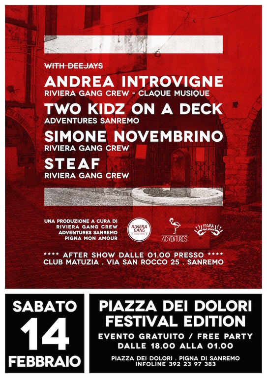 Venerdì 13 e Sabato 14 febbraio, nell'affascinante location di Piazza dei Dolori prenderà vita la due giorni dedicata alla musica elettronica. Un’innovativa idea nata dal gruppo Adventures Sanremo in collaborazione con Riviera Gang e Pigna mon Amour. Numeri importanti per questa manifestazione collaterale: 4 organizzazioni coinvolte, 12 ore di musica in 2 giorni e oltre 1200 persone previste.