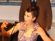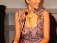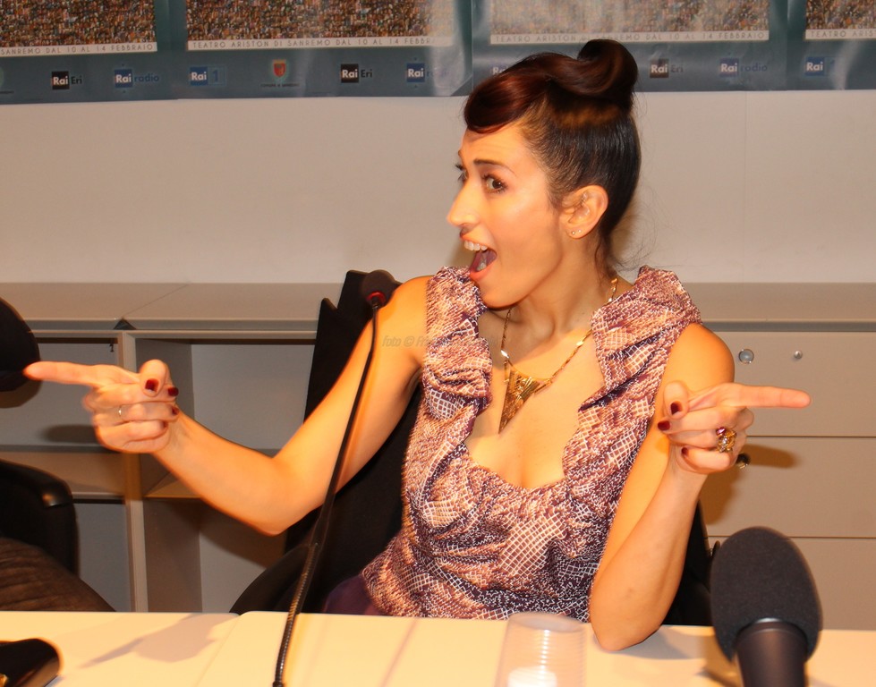 Nina Zilli si presenta al Festival con il brano "Sola". Si esibirà domani. È la prima artista in gara a presentarsi per le conferenze in sala radio e web. Bellissima e stilosa, e soprattutto puntuale al secondo.