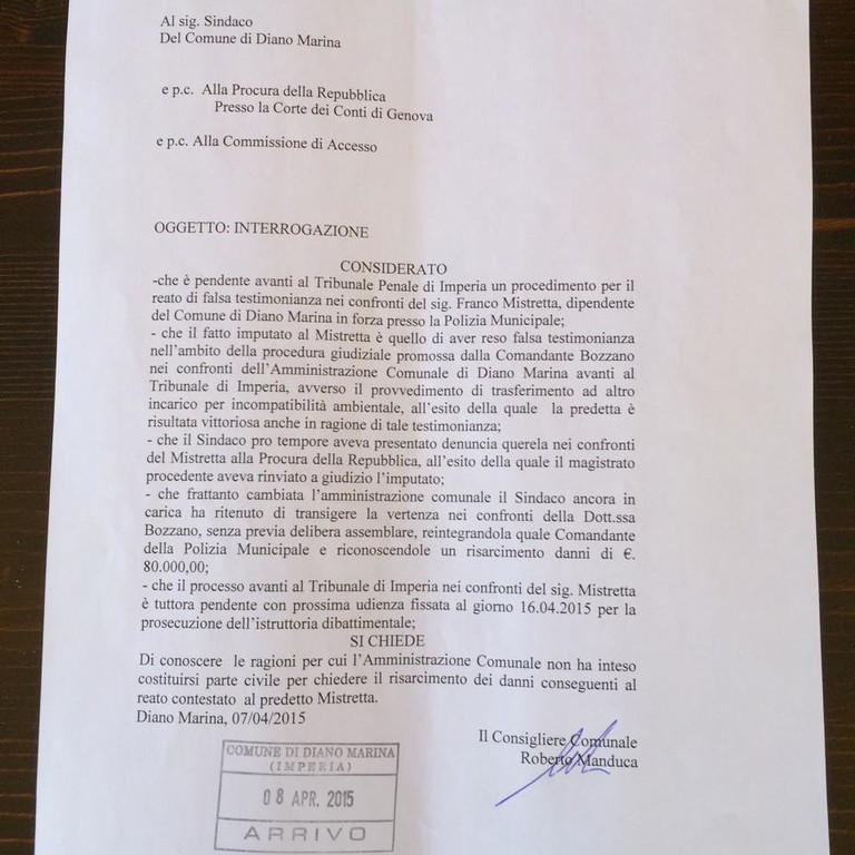 Il Consigliere Comunale di minoranza a Diano Marina, Roberto Manduca, ha presentato oggi un'interrogazione al Sindaco Giacomo Chiappori, e, per conoscenza la inoltra alla Procura della Repubblica, alla Corte dei Conti e ai membri della Commissione d'Accesso.