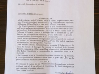 "Considerato - si legge nell'interrogazione - che è pendente avanti al tribunale penale di Imperia un procedimento per il reato di falsa testimonianza nei confronti del sig. Franco Mistretta, dipendente del Comune di Diano Marina in forza presso la Polizia Municipale, [...] si chiede di conoscere le ragioni per cui l'amministrazione non ha inteso costituirsi parte civile per chiedere il risarcimento dei danni conseguenti al reato contestato al predetto Mistretta".