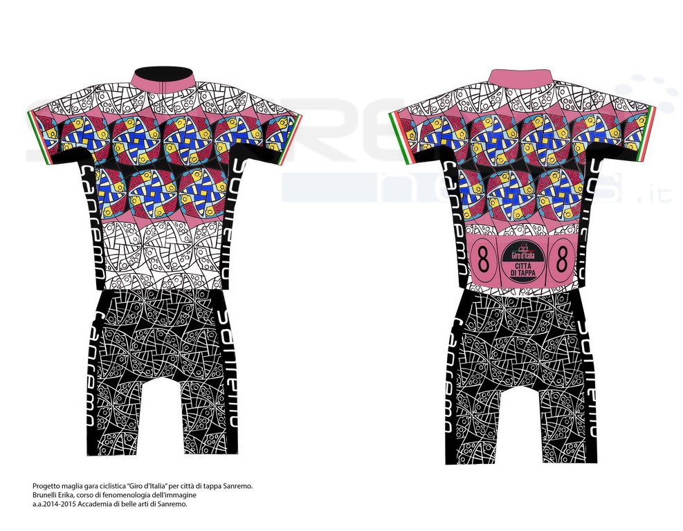 La prima tappa, la cronometro San Lorenzo al Mare-Sanremo, tutta definita nell’ammaliante scenario della pista ciclabile, ha suggerito molteplici spunti alle quattro allieve impegnate nel progetto. Sono maglie studiate per il ciclismo, quindi colorate e ben visibili. Sono stati studiati anche i tessuti e le necessità del corridore. In ogni caso, chissà che questi “concept” non possano anche essere riproducibili nella piena realtà, a memoria di un evento di altissimo profilo per la Liguria occidentale. Li presentiamo : Erika Brunelli ha realizzato un complesso maglia-pantaloncino molto ricco di suggestioni, quasi circense, da acrobata della bicicletta.