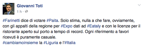 A scriverlo sul suo profilo Facebook è Giovanni Toti, candidato presidente alla Regionel Liguria.
