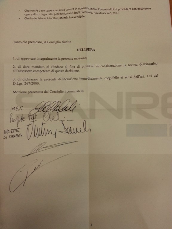 Dubbi da parte del consigliere Ballestra: “Non voterò questo ordine del giorno pur avendolo sottoscritto perché c’è qualcosa che non mi torna. La prima perizia era valevole solo per l’abbattimento di 2 alberi, poi la gara che è stata fatta il 2 aprile prevedeva di tagliarli tutti e 8, infine la perizia suppletiva con variazione da 2 a 8 gli alberi da tagliare è datata, secondo l’assessore, il 5 maggio. Allora o c’è qualcosa che non quadra oppure c’è una sorta di preveggenza da parte dell’amministrazione”.