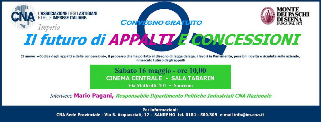 Il convegno si terrà domani, 16 maggio, a Sanremo, presso la Sala Tabarin del Cinema Centrale a partire dalle ore 10. Interverrà, in qualità di relatore, Mario Pagani, Responsabile Dipartimento Politiche Industriali CNA Nazionale. La partecipazione all’incontro è libera e gratuita.