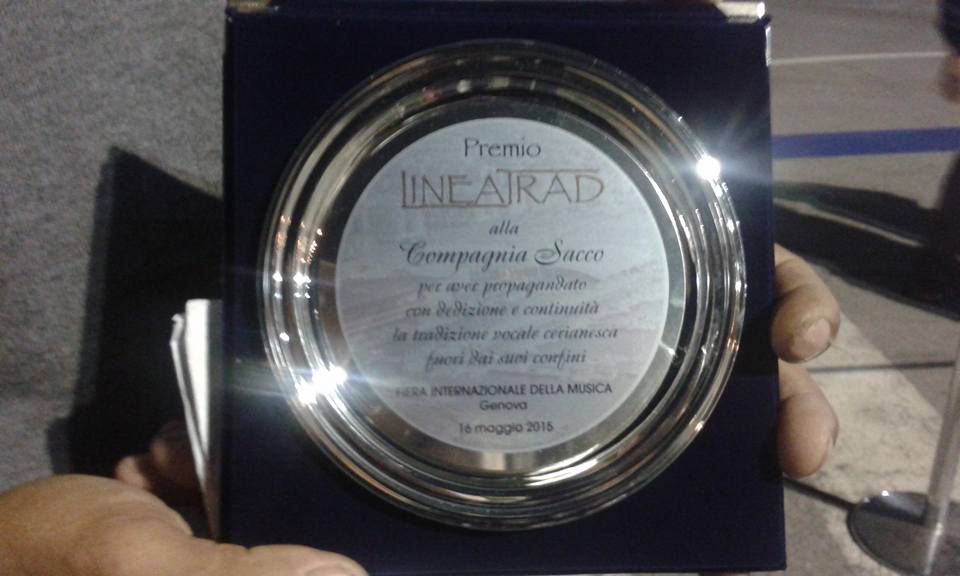 In occasione della 3° fiera Internazionale della Musica, che si è svolta a Genova tra il 15 ed il 17 maggio scorsi, la Compagnia corale ‘Sacco’ di Ceriana ha ricevuto il prestigioso premio ‘LINEA TRAD’ per il merito di aver conservato negli anni la tradizione vocale cerianasca e di averla divulgata al di fuori dei confini del ponente ligure.