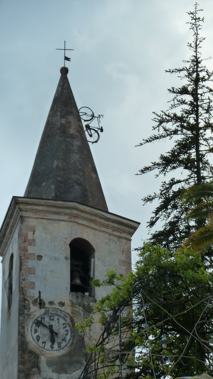Anche il campanile di Apricale attraverso una finestra in controluce lo ha immaginato come un grosso matitone e piazzandoci sopra una bicicletta come a pedalare in salita in alto in alto verso il cielo, ha voluto simboleggiare la sfida alla gravità, scrivendoci su anche una bella poesia.