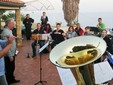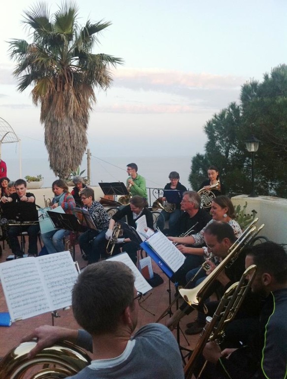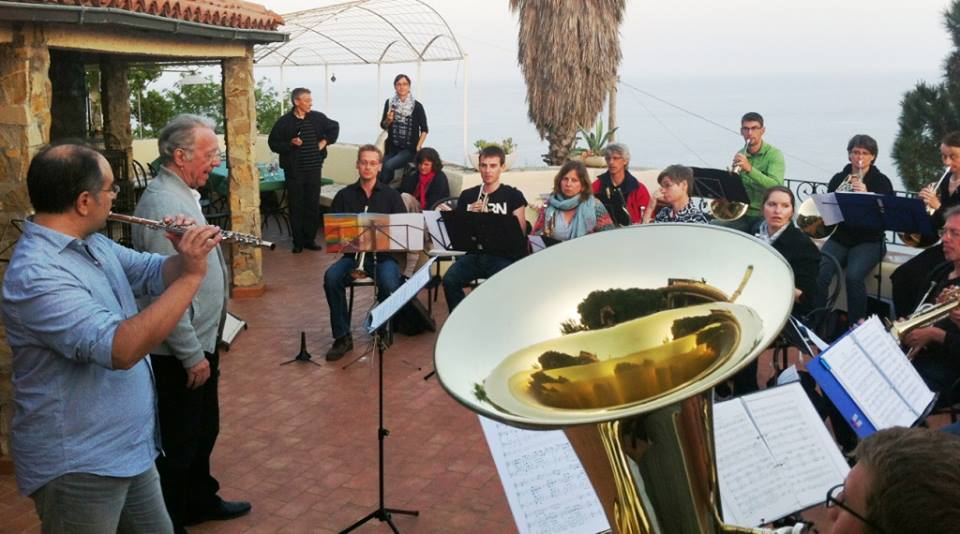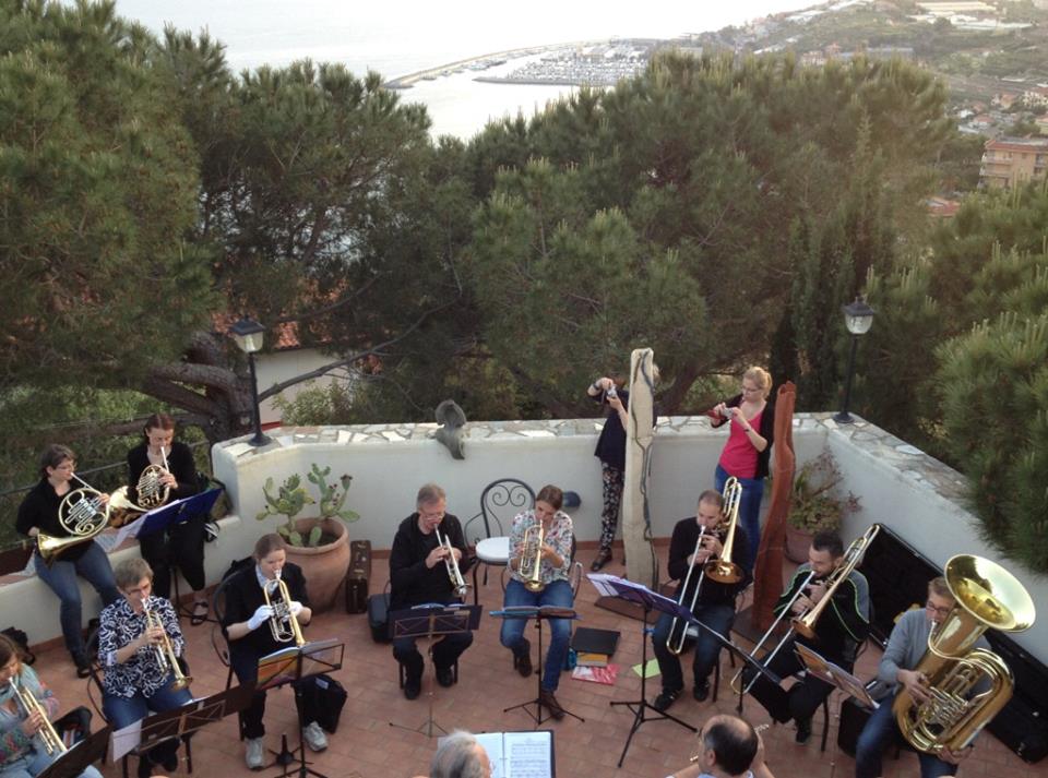 “Valerio Fasoli, fondatore dell'Accademia di Musica di Taggia, di cui è direttore, mi ha telefonato dicendomi che si trovava al Convento dei domenicani. Valerio è padovano, ma vive a Como, in Germania a Stoccarda e in vari altri luoghi, per cui è sempre un'occasione per me incontrarlo. Mi ha chiesto se poteva portare con sé un gruppo di amici a visitare il nostro giardino, dove sono presenti numerose opere d'arte. Naturalmente ho detto di si, immaginando che arrivasse accompagnato da uno o due amici. Quando ho aperto la porta, c'erano 21 elementi della Posaunenchor Orchestra di Stoccarda!!!! Hanno portato con loro gli strumenti e hanno improvvisato un concerto, che devono aver sentito anche a Cipressa: con una quindicina di ottoni vari è il minimo! Infine verso le undici di sera, prima di andar via, hanno suonato un paio di notturni di Haydn”, ci racconta Judit.