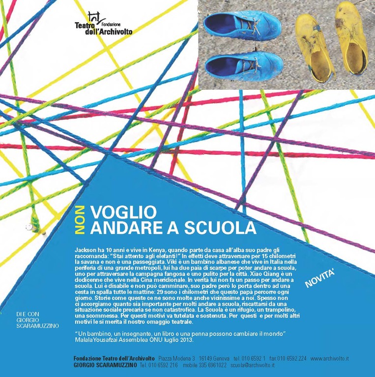 Lo spettacolo di domani racconta la testimonianza dei tanti bambini che “non” possono andare a scuola. "Spesso non ci accorgiamo quanto sia importante andarvi, riscattarsi da una situazione sociale precaria se non catastrofica. La scuola è un rifugio, un trampolino, una scommessa. Per questi motivi va tutelata e sostenuta e merita il nostro omaggio teatrale. - precisa Loretta Marchi - La Rassegna 2014-2015 ha avuto un largo seguito presso le scuole della città: vi hanno partecipato ben 1.500 bambini".