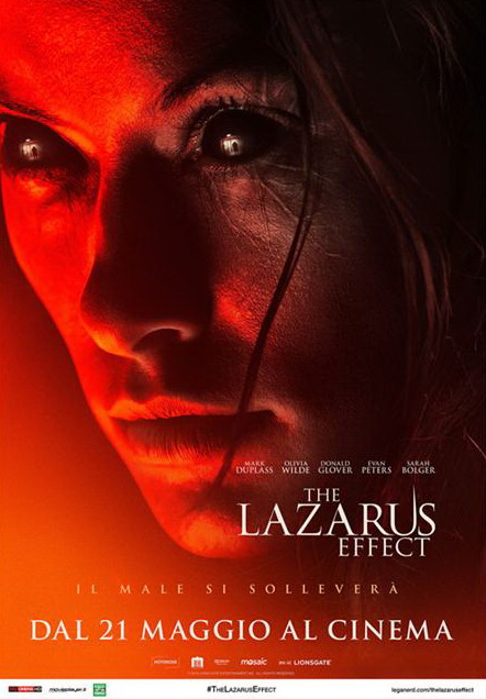 - THE LAZARUS EFFECT - ore 16.00 - 19.00 - 21.30 – di David Gelb – con Mark Duplass, Olivia Wilde, Sarah Bolger, Evan Peters, Donald Glover, Scott Sheldon, Emily Kelavos – Horror/Thriller - "Un gruppo di ricercatori, capeggiati da Frank e dalla sua fidanzataZoe fanno un'incredibile scoperta: trovano il modo di riportare in vita i defunti. Dopo aver completato con successo, ma senza autorizzazione, un esperimento su un animale appena morto, il rettore della loro Università viene a sapere degli esperimenti sotterranei e il progetto viene improvvisamente sospeso. Tutto il team decide comunque di riprodurre l'esperimento ma, a causa di un incidente, Zoe, viene orribilmente uccisa. Frank, pervaso dal terrore e dal dolore, convince il gruppo a fare qualcosa di impensabile: tentare di resuscitare la prima cavia umana. Inizialmente, la procedura si rivela un successo, ma la squadra presto si rende conto che qualcosa in Zoe non va. L'utilizzo su un essere umano, infatti, porterà a pericolosi e inimmaginabili conseguenze per tutti…”