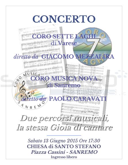 Il coro Sette Laghi di Varese sarà ospite a Sanremo, sabato 13 giugno ore 17,30 nella Chiesa di S.Stefano in Piazza Cassini, per un concerto con il coro Musica Nova: Due percorsi musicali, la stessa gioia di cantare.