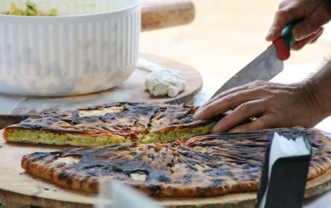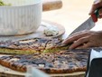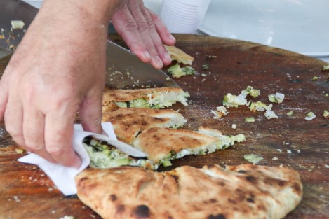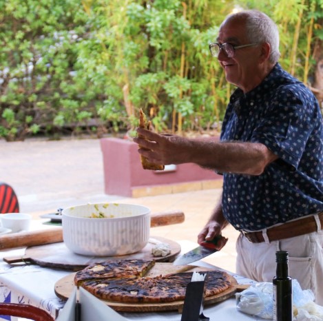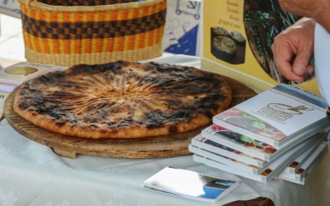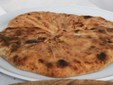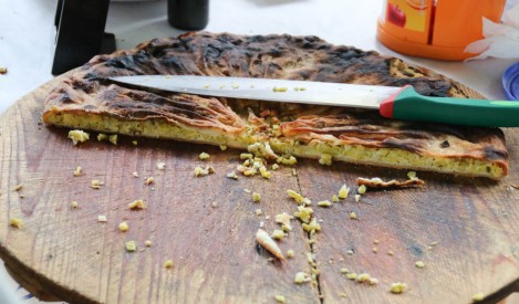 Stendete la sfoglia su un tagliere di legno, datele forma circolare e fatela debordare, quindi versate il ripieno; tirate la pasta dall’esterno con delicatezza e ricoprite la parte superiore con ripetute piegature (copertura «con le rughe»). Cospargete di olio e perforate in più punti con la forchetta. Fate cuocere nel forno a legna direttamente sulla piastra, senza l’impiego di una teglia, per 40-50 minuti. Presto si sentirà un profumino da far venire l’acqualina in bocca anche a coloro che detestano le verdure…specialmente i bimbi!