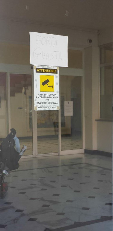 - Dopo avere 'scalato' la rampa con una pendenza di circa 20 %, arrivato in alto ma stanco, non ho visto il cartello che consisteva in un semplice foglio di carta con una scritta appena visibile 'Porta Guasta' ad un’altezza di circa 2 m allora che noi disabili seduti su una sedia a rotelle abbiamo una visione dal basso a circa 1,20 m...
