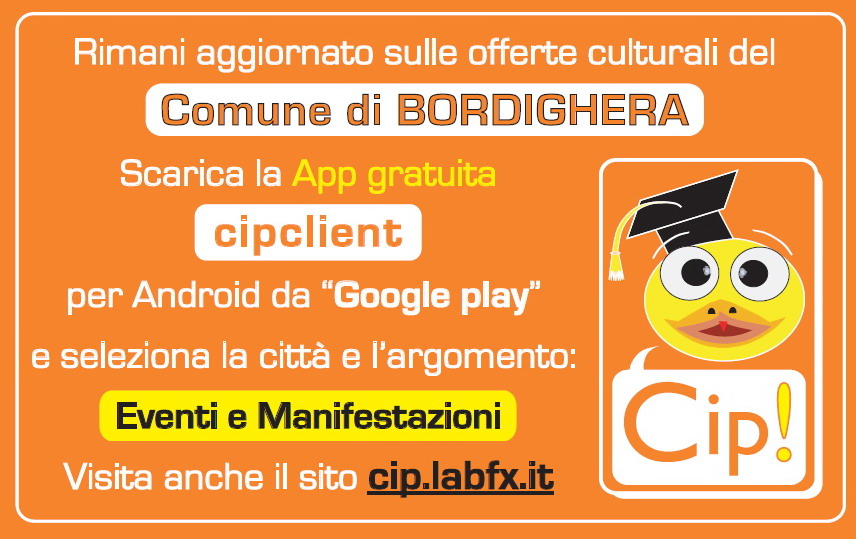 Il secondo servizio, denominato “Cip!” sviluppato dallo Studio Tecnico Babele di Vallecrosia – servizio avviato ancora in forma sperimentale – consente al settore turismo e cultura di effettuare un’inserzione giornaliera che sarà poi visibile a tutti gli utenti che avranno preventivamente e gratuitamente scaricato sul loro smartphone Android l’app relativa. Per conoscere orari e tipologia degli spettacoli sarà sufficiente selezionare la categoria “Eventi e Manifestazioni”, previa indicazione della località specifica (nel nostro caso “Bordighera”).