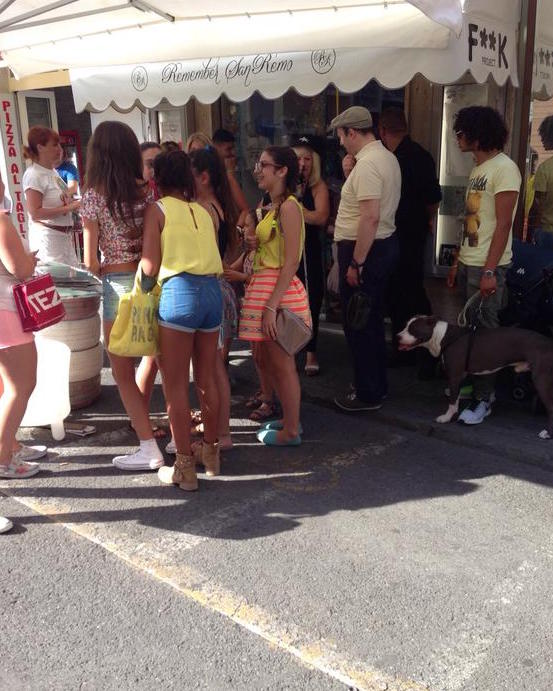 Fuori dal negozio una lunga fila di appassionati della trasmissione e dei suoi protagonisti, oltre ovviamente ai clienti del negozio.