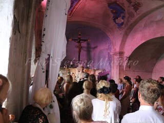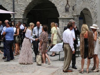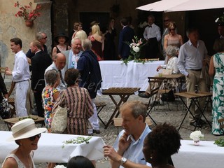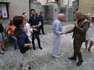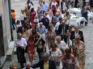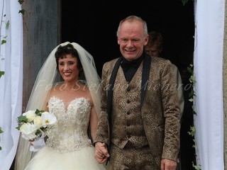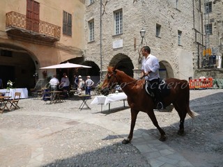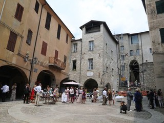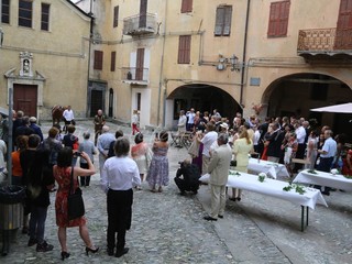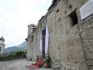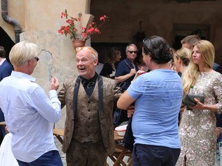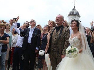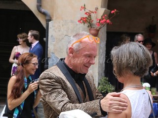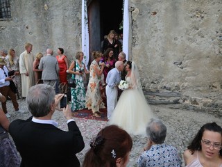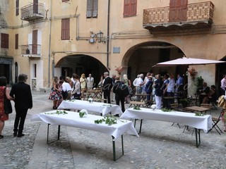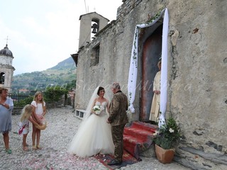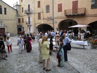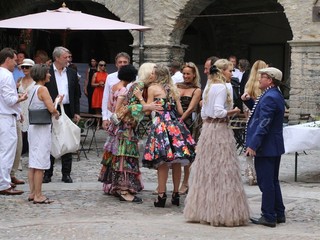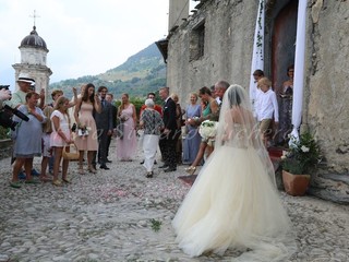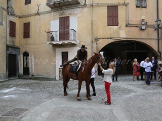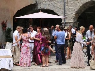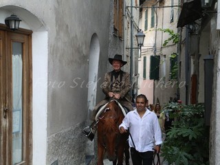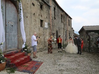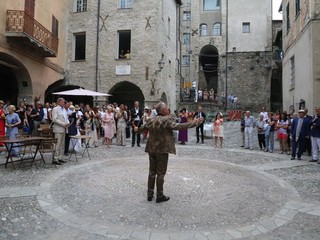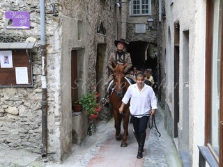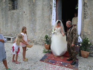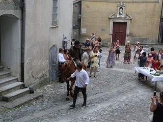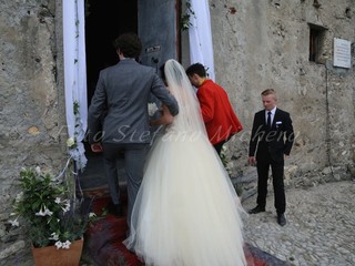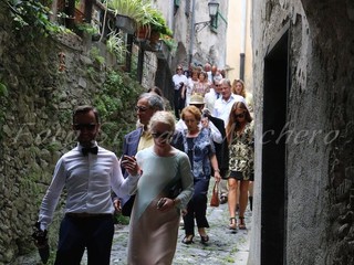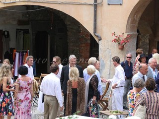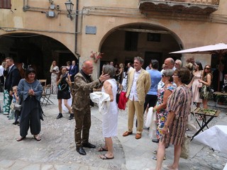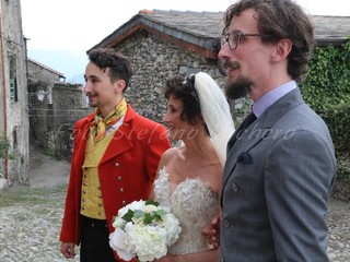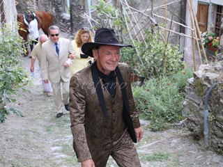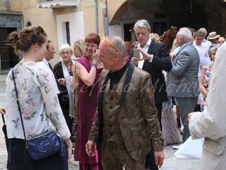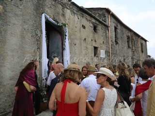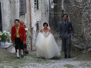 La piazza della collegiata, centro del pittoresco borgo, è stata il teatro del rendez-vous con lo sposo, presentatosi in perfetto orario con un vestito di taglio classico a fantasia leopardata. Poi, Per Christian Ellefsen in groppa ad un cavallo e con al seguito gli invitati e tra questi ovviamente anche molti abitanti della vallata, si è diretto alla volta del ‘castello’ ed infine alla chiesa di San Dalmazio. Questa piccola cappella antica, cimelio della storia di Triora, fa parte del Palazzo Capponi, dimora dell’attore.