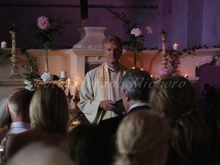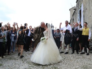 La sposa è arrivata poco dopo con uno splendido abito color crema, scortata da persone in costume. Il rito è stato officiato all’interno della chiesa alla presenza di un prete invitato per l’occasione. Al termine della cerimonia un drone ha sorvolato l’area intorno alla cappella per scattare un’indimenticabile foto ricordo ed a quel punto ha preso il via la festa. Nella piazza del paese lì dove si erano incontrati gli invitati ed i novelli sposi si sono messi a ballare sulle note di alcune canzoni medievali. Si è trattato di un vero e proprio matrimonio da film ad onore della carriera di questo noto attore teatrale e cinematografico, con tanto di nomination agli Oscar.