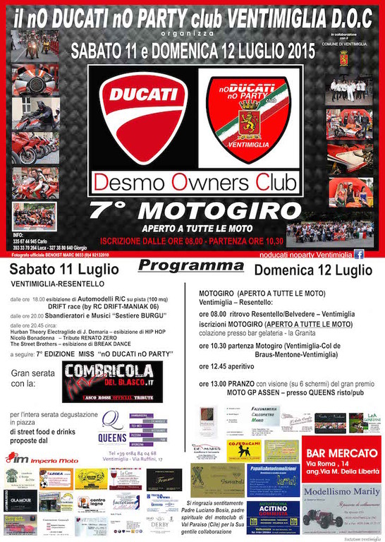 Anche quest’anno si rinnova, dopo il grande successo delle passate edizioni, l’appuntamento con l’attesissimo 7° Raduno Motociclistico organizzato dal No Ducati No Party D.O.C. Club aperto a tutte le moto presso il Resentello di Ventimiglia. L’evento si volgerà in due giornate Sabato 11 e Domenica 12 Luglio. Domani, Sabato pomeriggio a partire dalle ore 16.30 circa, esibizione di Drift con modellini auto radiocomandati. La sera a partire dalle ore 20.30 circa appuntamento con la sfilata ed elezione della Miss ed a seguire grande serata live con la Combricola Del Blasco. Durante tutta la serata il Queens Pub dello Street Food preparando degustazioni di svariati piatti.
