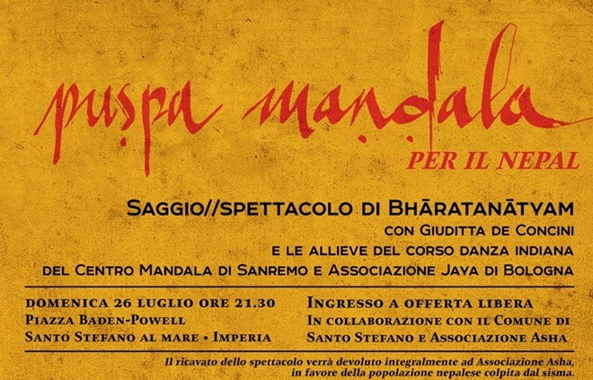 Si tratta di uno spettacolo di danza e teatro dell'India del Sud ‘Per non dimenticare il Nepal’, uno spettacolo di Bharatanatyam con Giuditta de Concini e le allieve del corso di danza indiana del Centro "Il Mandala" di Sanremo e Associazione Jaya di Bologna, in collaborazione con il Comune di Santo Stefano al Mare.