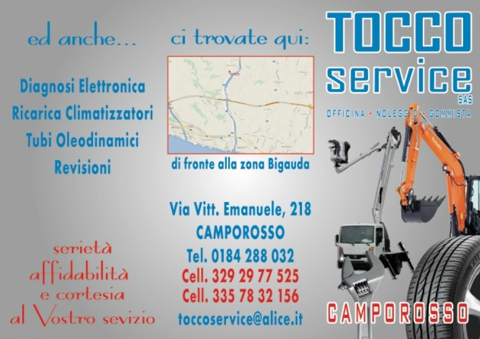 La ‘Tocco Service’, che trovate a Camporosso in via Vittorio Emanuele, 218 (di fronte alla zona Bigauda), è da oltre trent’anni al vostro servizio con serietà, affidabilità e cortesia. L’attrezzatissima officina meccanica offre la riparazione per veicoli di qualsiasi marca e modello, sia per autovetture che per mezzi commerciali, movimento terra o da cantiere.