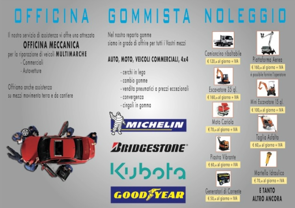 E non solo, data la versatilità dell’azienda, è presente anche un fornitissimo reparto pneumatici di marche eccellenti e a prezzi eccezionali per tutti i vostri mezzi, senza dimenticare i correlati servizi di cambio gomme e convergenza.