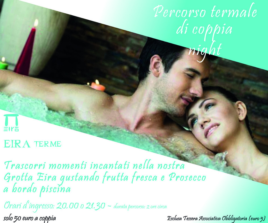 Lunedì 3 Agosto, a grande richiesta e in programma tutti i lunedì d'estate, ritorna infatti il Percorso Termale di Coppia Night. Trascorri momenti incantati nella peculiare Grotta Eira, un percorso rilassante in luce soffusa all'interno del calore delle acque termali, gustando nell'Idromassaggio frutta fresca e un buon Prosecco. Gli orari d'ingresso sono alle 20 o alle 21.30. Per tutte le info è possibile visitare la pagina dedicata www.eiraterme.it. La prenotazione è obbligatoria e i posti sono limitati. Per info e prenotazioni è possibile chiamare 0183493552.